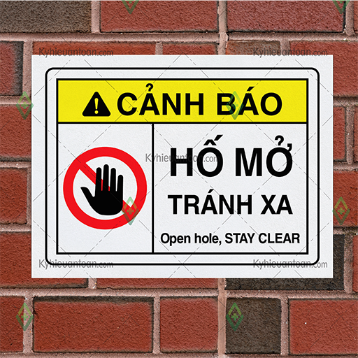 Biển cảnh báo “Nguy hiểm hố mở tránh xa” (Open Hole, Stay Clear) được thiết kế để cảnh báo về sự hiện diện của các hố hoặc hầm đào mở có thể gây ra nguy hiểm cho người qua lại. Các biển cảnh báo này rất quan trọng trong việc bảo vệ an toàn và giảm thiểu nguy cơ tai nạn.