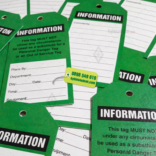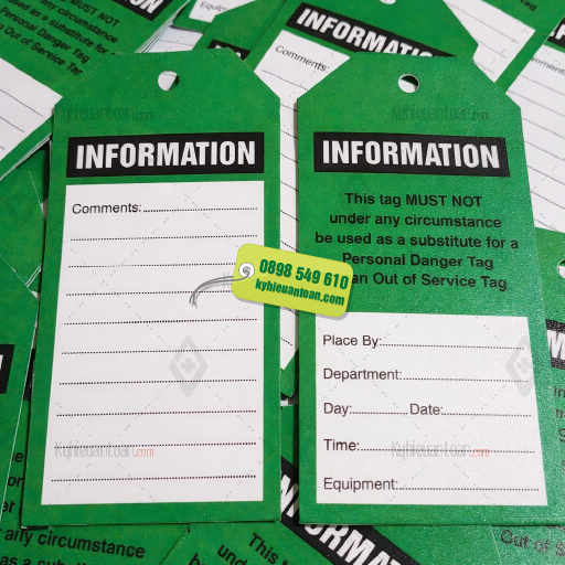 Thẻ INFORMATION – thẻ thông tin thiết bị là loại thẻ cảnh báo được sử dụng phổ biến trong nhà máy, xưởng sản xuất và hệ thống máy móc công nghiệp. Thẻ giúp **ghi chú thông tin, tình trạng thiết bị hoặc hướng dẫn vận hành** để nhân viên dễ dàng nhận biết khi kiểm tra hoặc bảo trì.